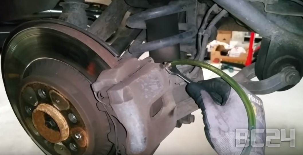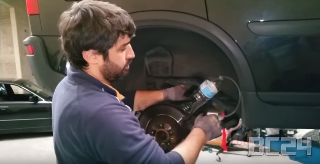 Впереди тормозная жидкость чище, так как контур спереди маленький и она ближе к бачку. Мы начинали с заднего левого колеса, вторым было переднее правое, а потом, заднее правое и последнее — переднее левое.