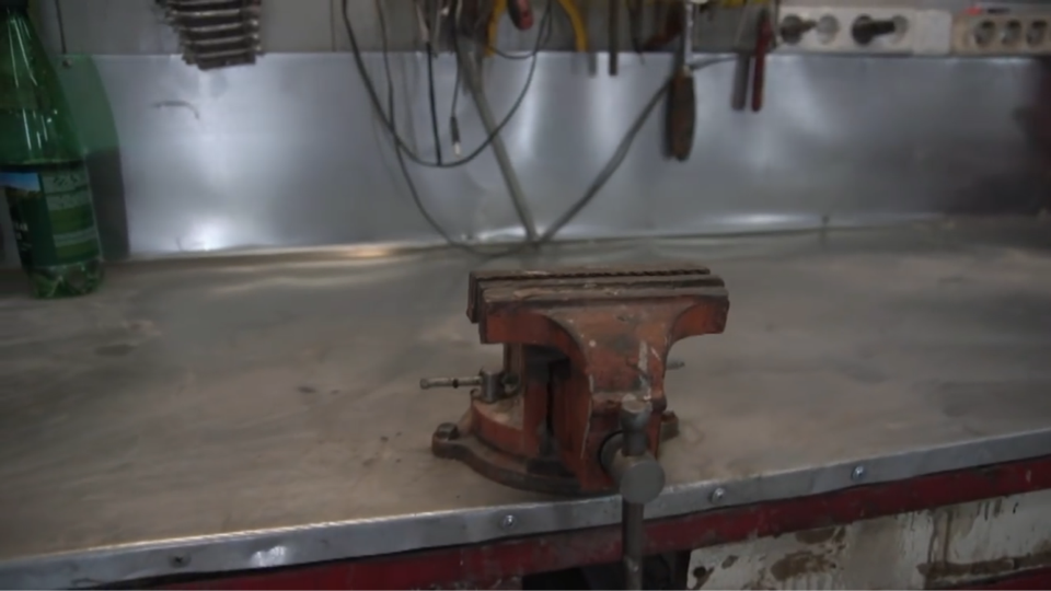 Верстак, как я говорил, сваренный из уголков металлических, поверх лежит лист фанеры и покрыто листом оцинкованной стали, самая дешевая обычная оцинковка, за 300 рублей – это расходник.